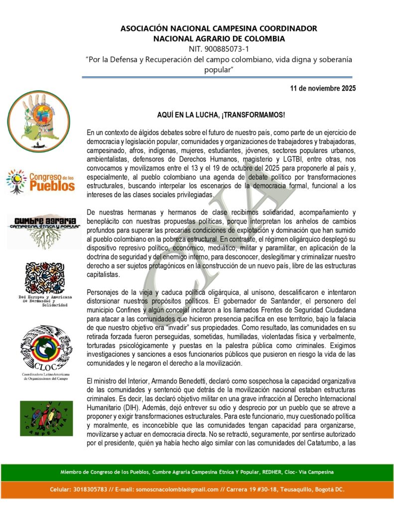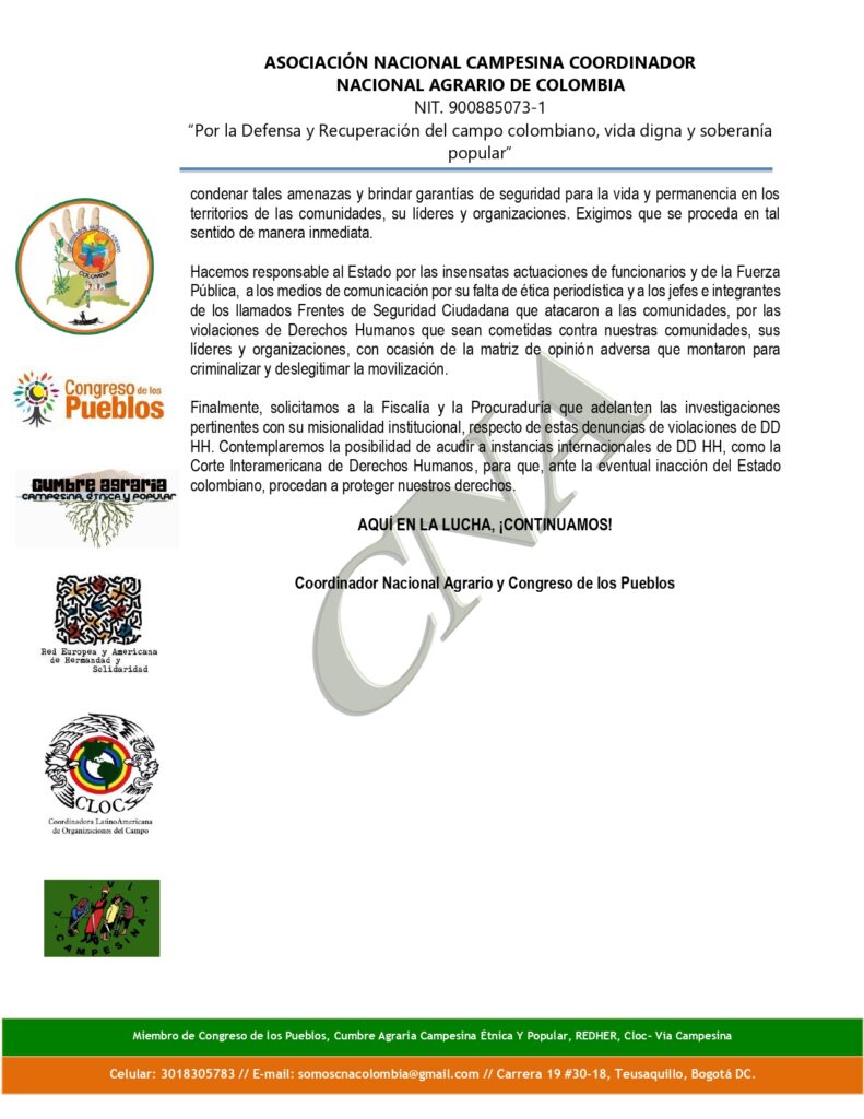 Una vez en los territorios, varios líderes fueron amenazados por paramilitares del Clan del Golfo y el Frente 33, estructuras con las que el Gobierno sostiene “diálogos de paz”. Además, la Fiscalía General de la Nación, como instrumento de represión, continúa su actuar contra participantes en la movilización, capturando a Alejandro Vitacuy, hijo de la autoridad Lázaro Vitacuy, preso desde hace tiempo en las mazmorras del Estado. Le corresponde al Gobierno condenar tales amenazas y brindar garantías de seguridad para la vida y permanencia en los territorios de las comunidades, su líderes y organizaciones. Exigimos que se proceda en tal sentido de manera inmediata.
