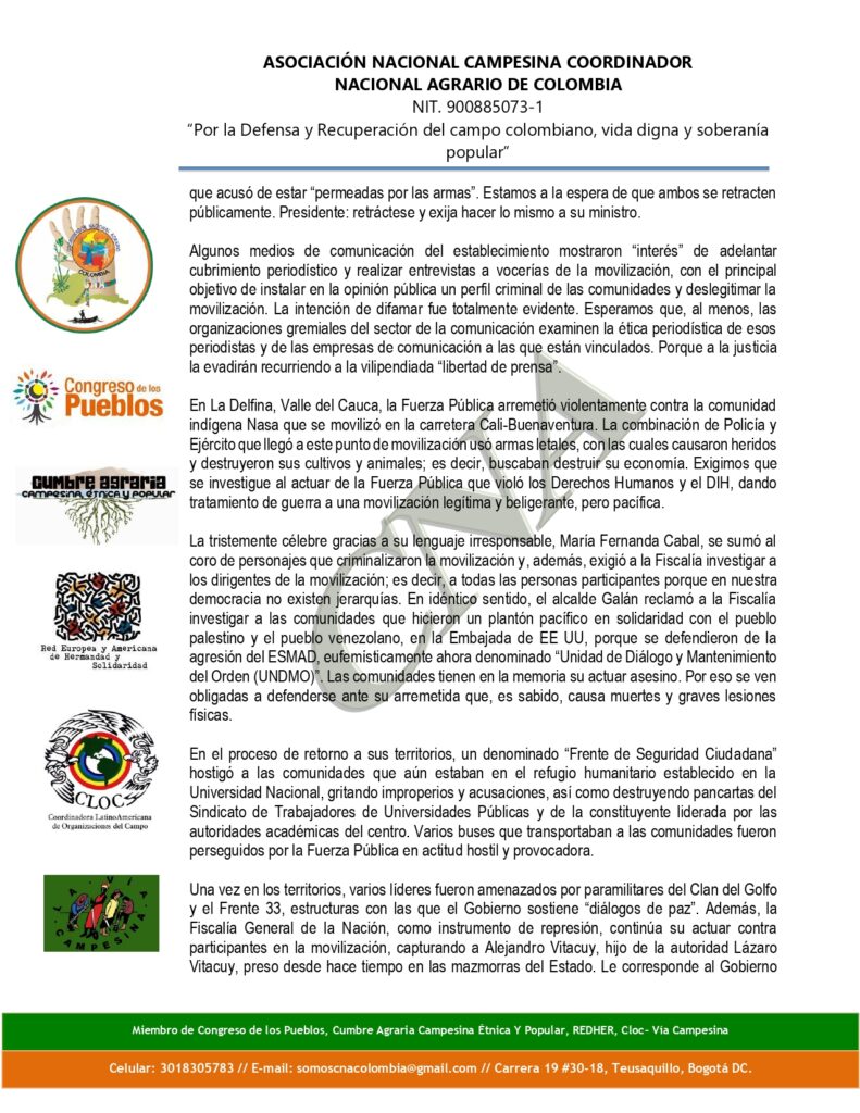 Hacemos responsable al Estado por las insensatas actuaciones de funcionarios y de la Fuerza Pública,  a los medios de comunicación por su falta de ética periodística y a los jefes e integrantes de los llamados Frentes de Seguridad Ciudadana que atacaron a las comunidades, por las violaciones de Derechos Humanos que sean cometidas contra nuestras comunidades, sus líderes y organizaciones, con ocasión de la matriz de opinión adversa que montaron para criminalizar y deslegitimar la movilización.